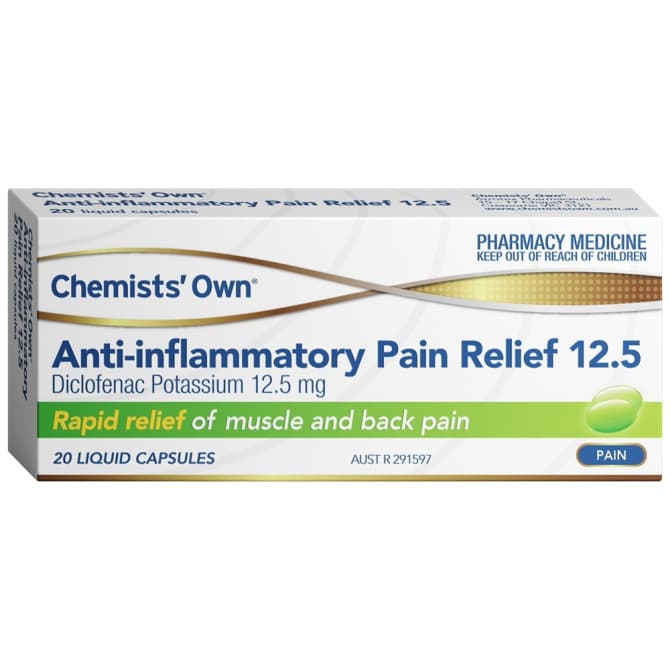 Tags: Chemists Own Anti Inflammatory Pain Relief 12.5 ML Liquid 20 Capsules, 9350299007404, Pain Relief
